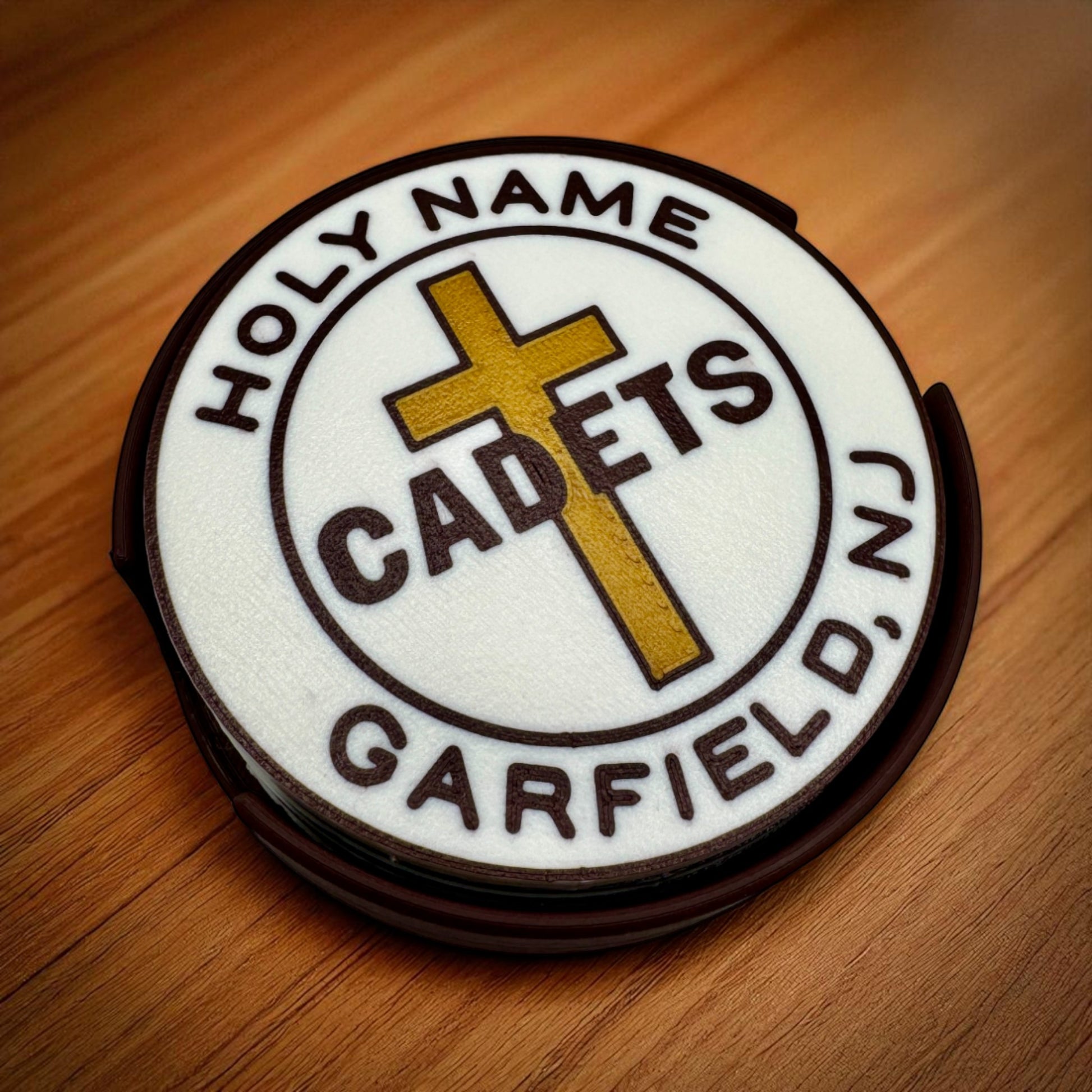 Bring a piece of drum corps history into your home with this beautifully crafted Holy Name Patch Coaster Set inspired by the iconic patch from The Cadets’ uniforms. Expertly 3D printed with high-quality PLA in a striking maroon color, these coasters capture the essence of this beloved design.